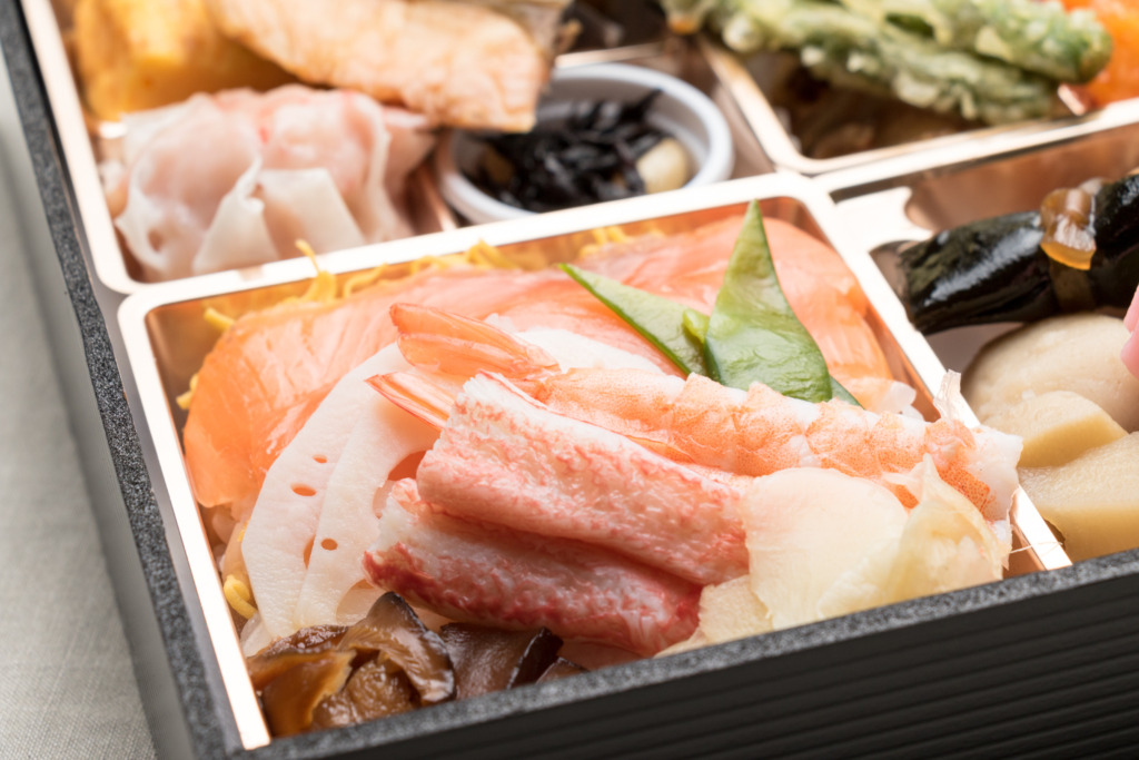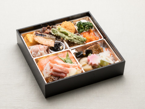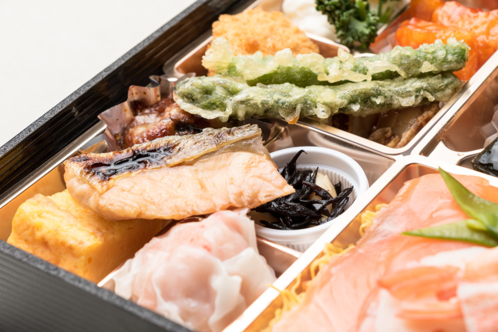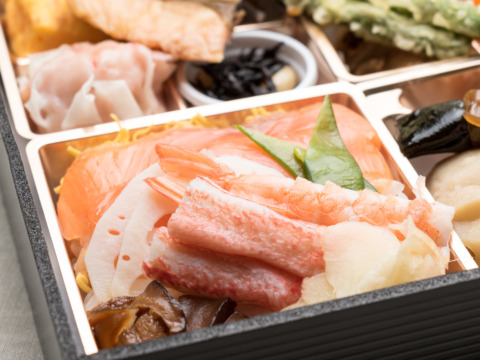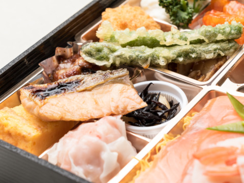 彩り豊かなサーモンチラシは酢飯でさっぱりと。小升に仕切られた副菜の数々は小さな和食コースを思わせる贅沢なお弁当です。