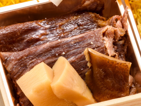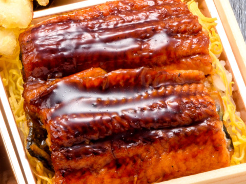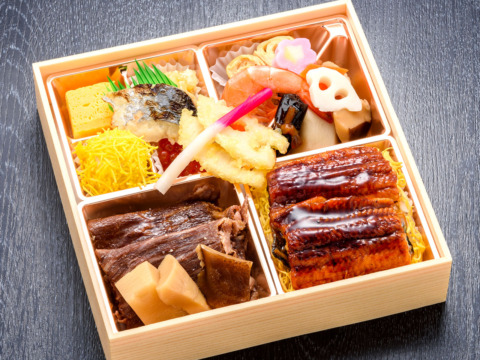 うなぎ・すき焼き・焼魚・錦糸焼売・玉子焼き・煮物(芋・筍・人参・椎茸・蓮根・ふき)・無頭エビ