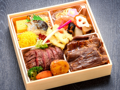 道産牛ヒレステーキ・すき焼き・焼魚・錦糸焼売・玉子焼き・煮物(芋・筍・人参・椎茸・蓮根・ふき)・無頭エビ